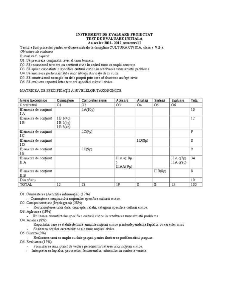Matrice Test Initial Cultura Civica Clasa A Vii A