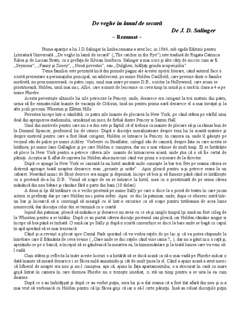 Rezumat De Veghe In Lanul De Secara De J D Salinger