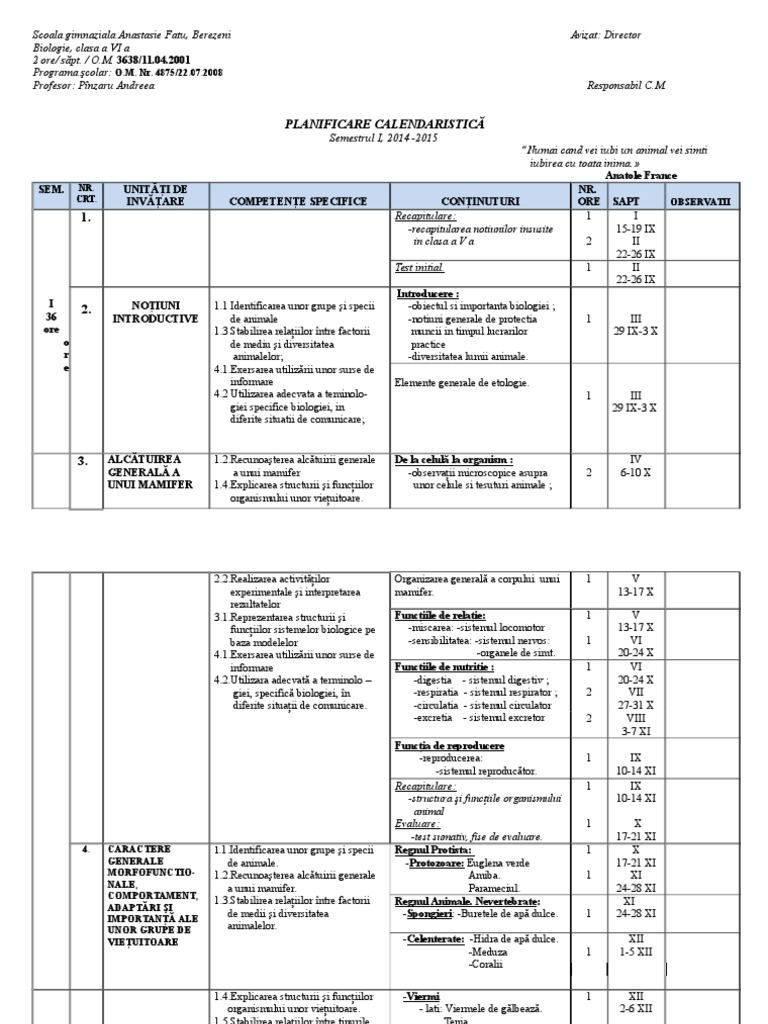 Planificare Pe Unitati De Invatare Biologie Clasa 6