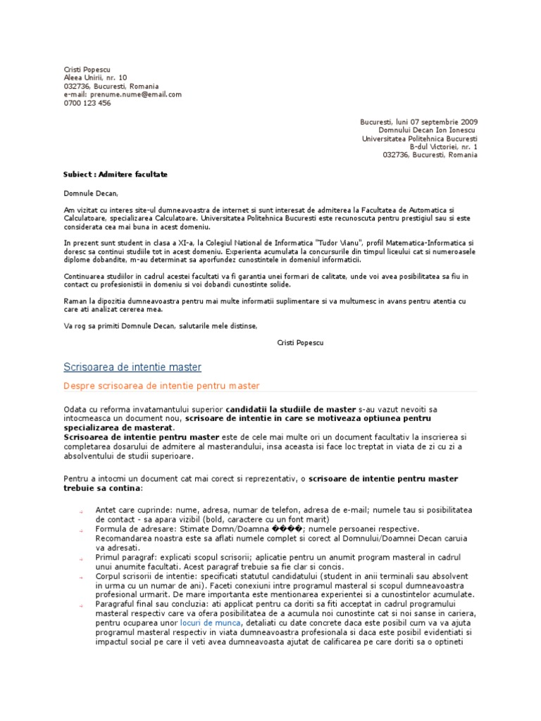 Model Scrisoarea De Intentie Master