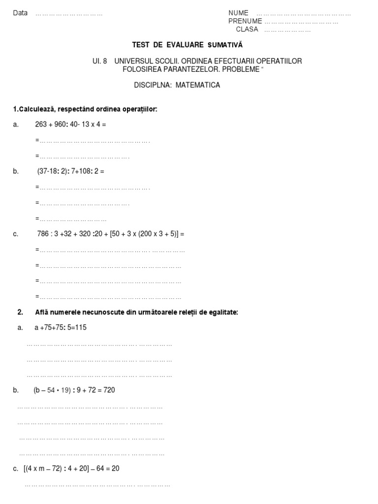 Test Mateui 8 Ordinea Efectuarii Operatiilor Folosirea Parantezelor